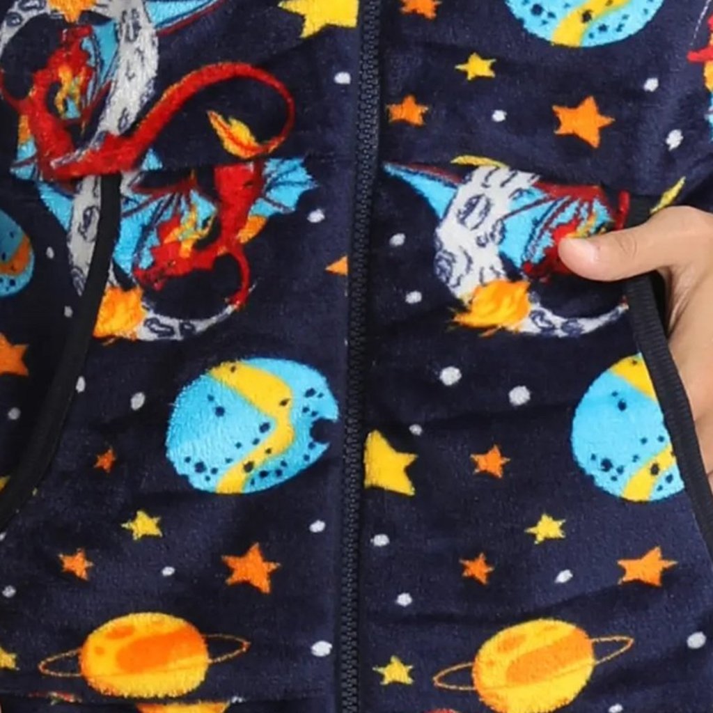 Zábava / Kostým: Někdy se tyto overaly s motivy (jako jsou zde vesmír) používají i pro zábavu, například na pyžamových večírcích, jako neformální kostým nebo jen pro dobrou náladu.