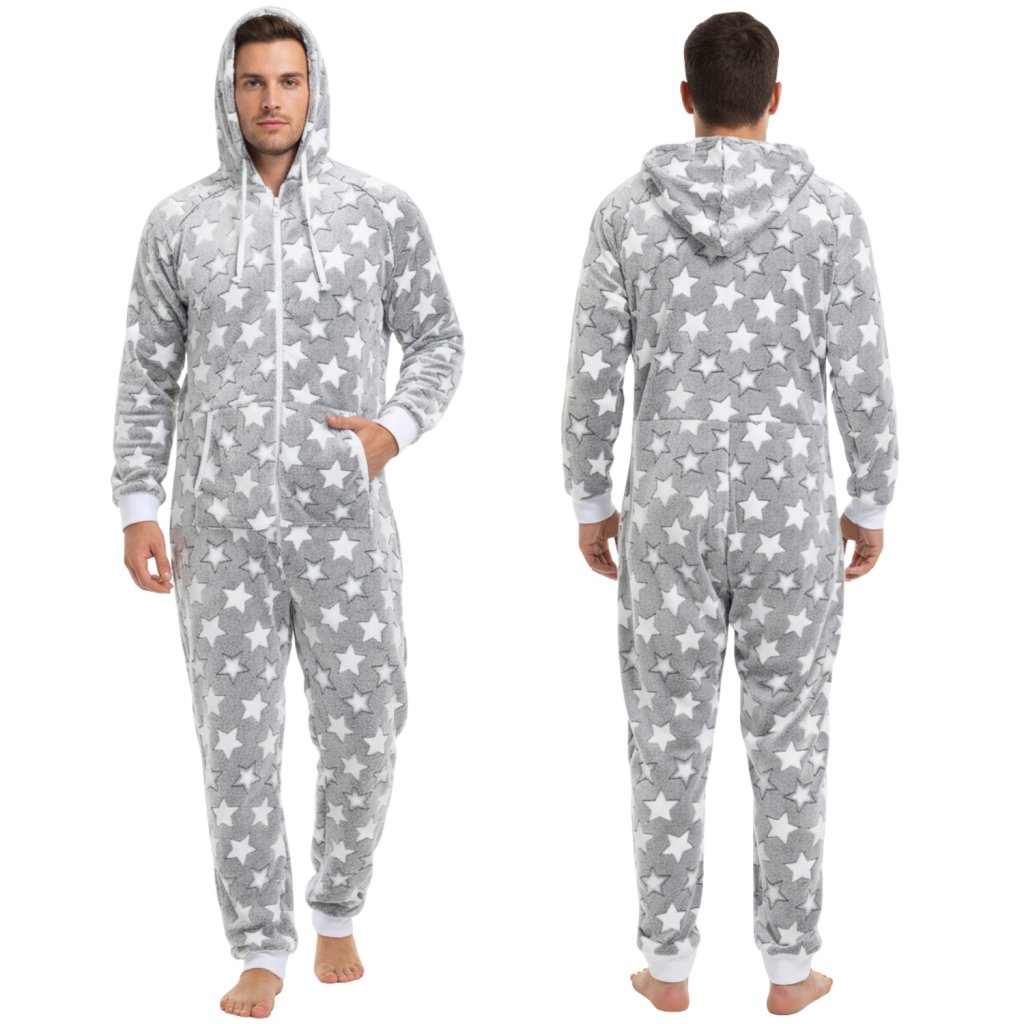 Pánský overal na oboustranný zip, komfortní volný střih; kapuce, obšívané kapsy; příjemný "plyšový" materiál vhodný na celoroční domácí nošení