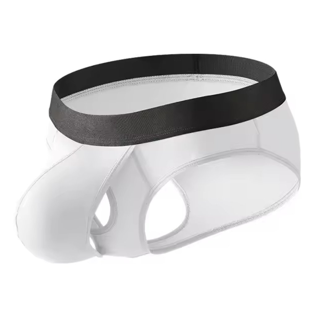 Eroticky řešené slipy na zvýraznění předních partií; Metalický vzhled pasové gumy; V přední části je vnitřní průlez & vnější váček - mezi vnějším váčkem a vnitřním průlezem není z boků napojení látky - volné / průlezné z obou stran (do váčku lze tedy z vnitřku prostrčit intimní partie zcela ven)