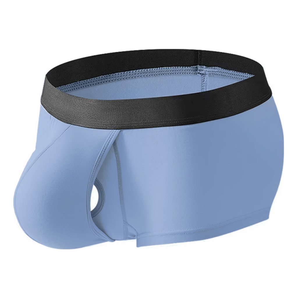 Eroticky řešené boxerky na zvýraznění "půlek" i předních partií; Metalický vzhled pasové gumy; V přední části je vnitřní průlez & vnější váček - mezi vnějším váčkem a vnitřním průlezem není z boků napojení látky - volné / průlezné z obou stran (do váčku lze tedy z vnitřku prostrčit intimní partie zcela ven);