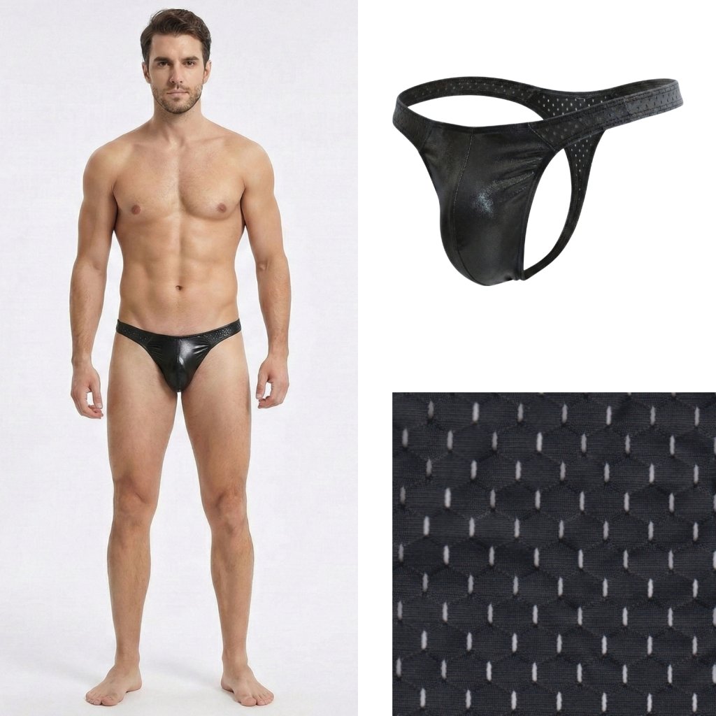 Přední "váček" je ergonomicky tvarovaný (často označovaný jako contour pouch). Lesklý materiál odráží světlo, což opticky zvýrazňuje a dodává objem intimním partiím, zatímco střih poskytuje potřebnou oporu a "nadzvednutí".