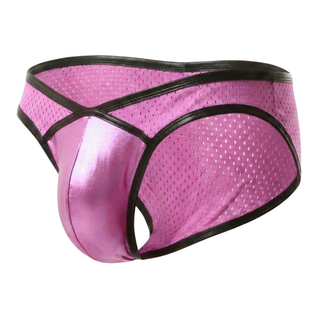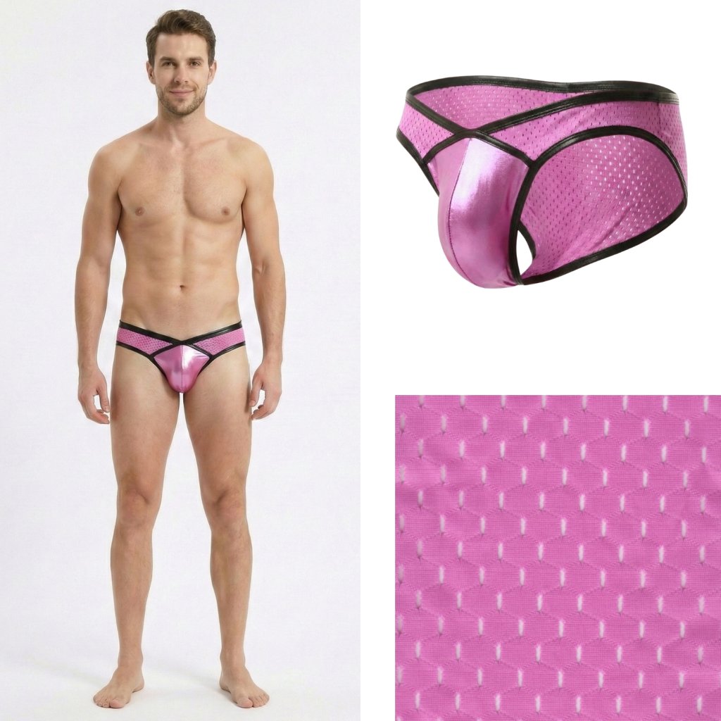 Přední "váček" je ergonomicky tvarovaný (často označovaný jako contour pouch). Lesklý materiál odráží světlo, což opticky zvýrazňuje a dodává objem intimním partiím, zatímco střih poskytuje potřebnou oporu a "nadzvednutí".
