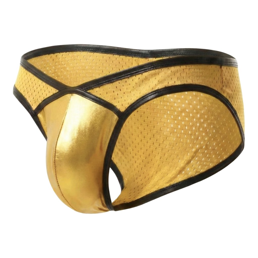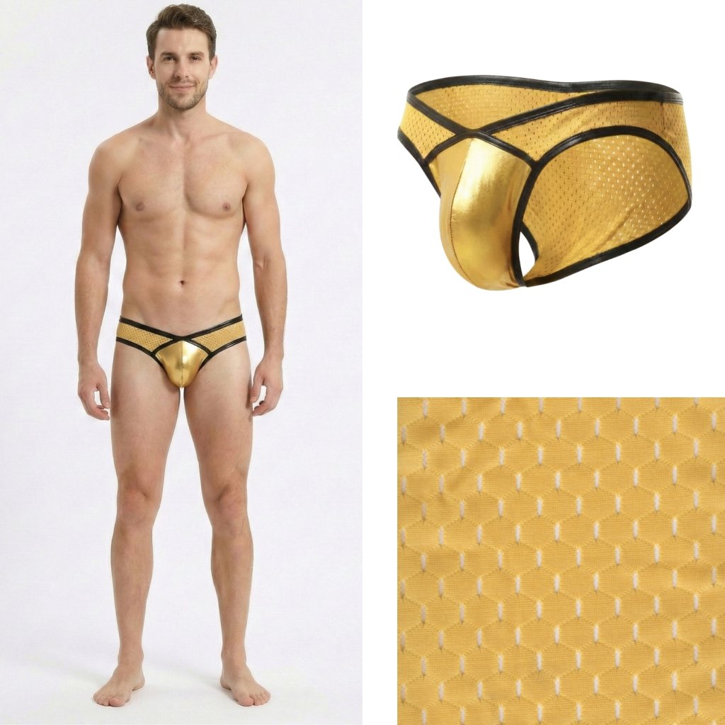 Přední "váček" je ergonomicky tvarovaný (často označovaný jako contour pouch). Lesklý materiál odráží světlo, což opticky zvýrazňuje a dodává objem intimním partiím, zatímco střih poskytuje potřebnou oporu a "nadzvednutí".