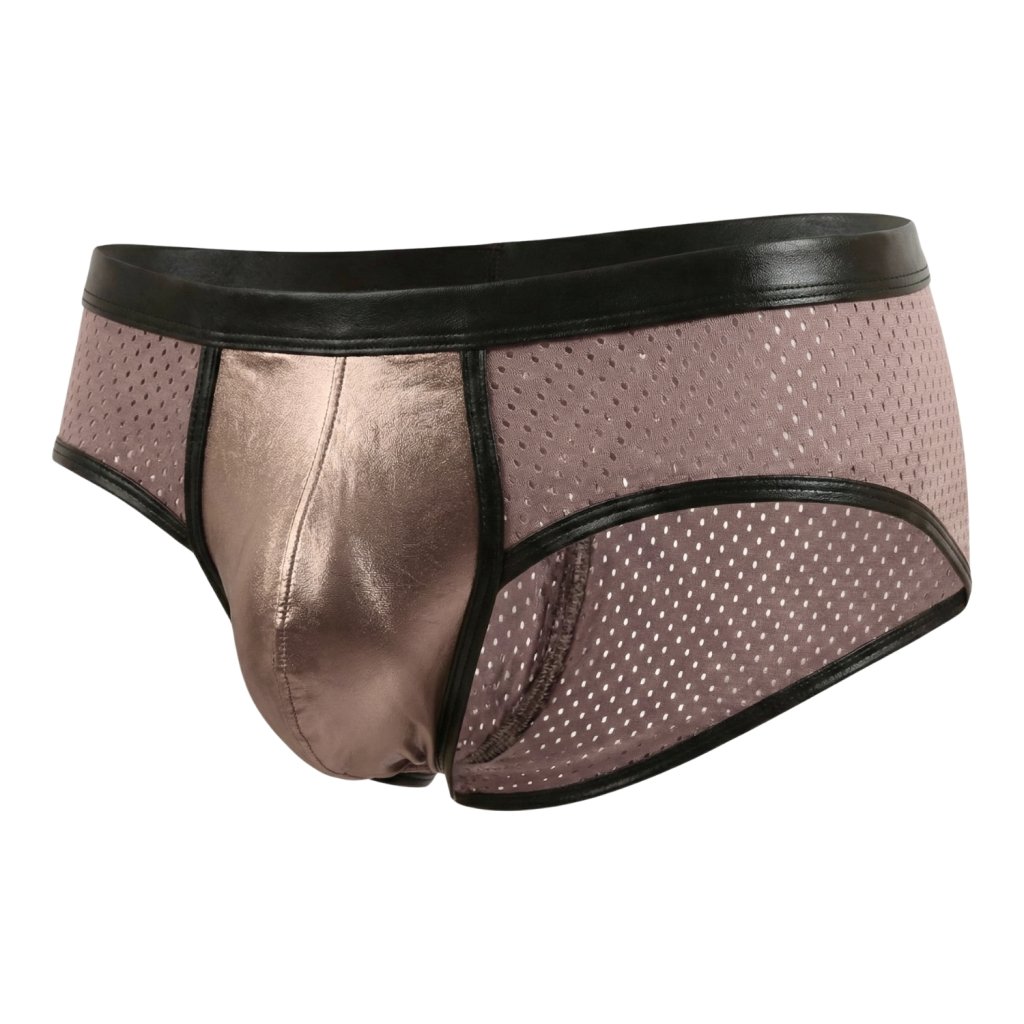 Komfortní erotické slipy ergonomického střihu s matně lesklým pasem a lemováním; Přední intimní partie metalického / matně metalického vzhledu dle foto;