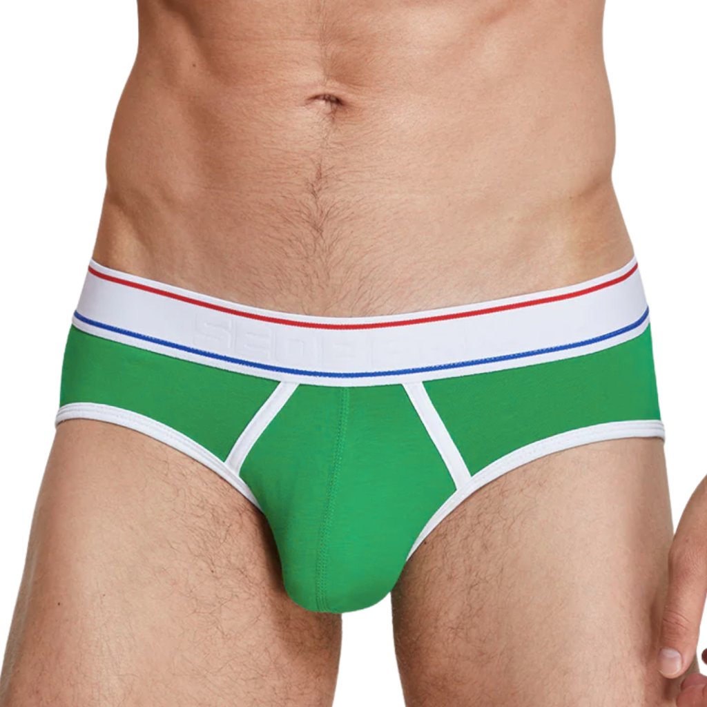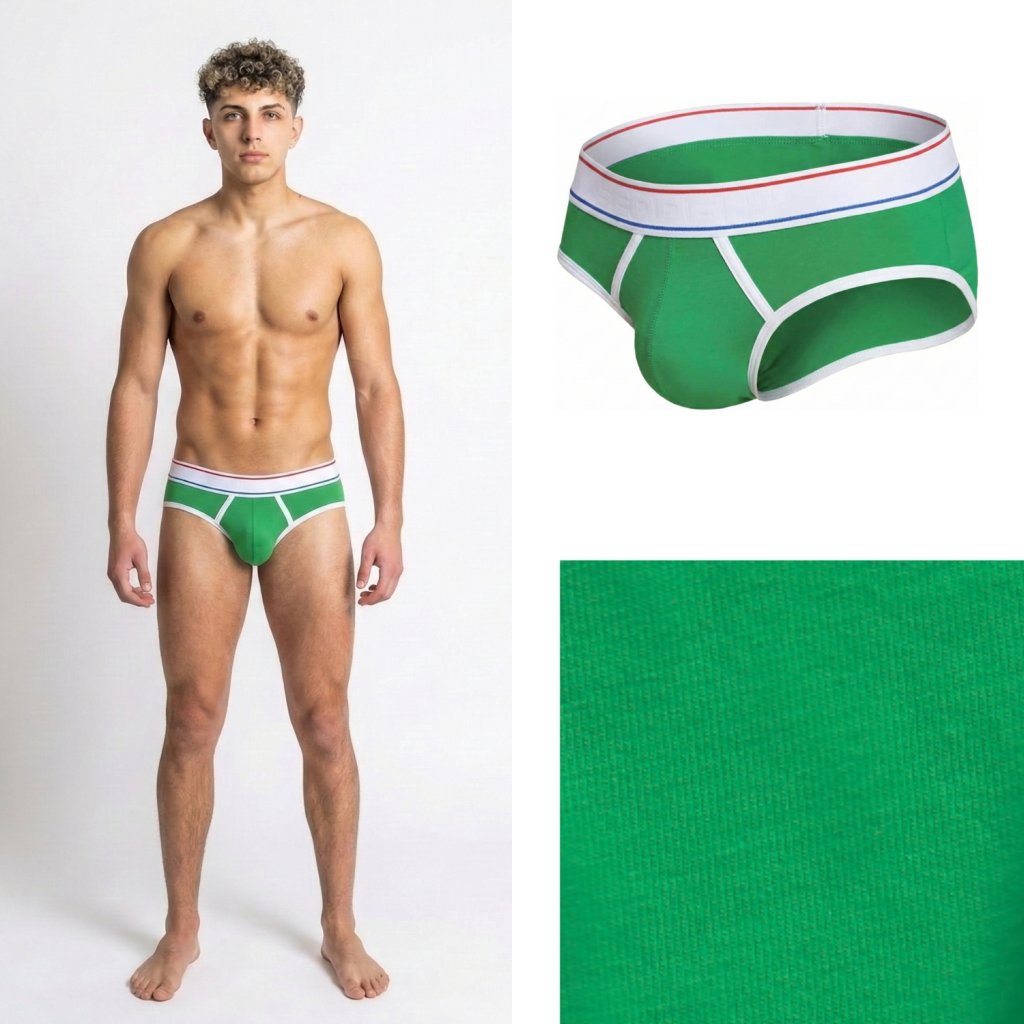 Slipy kontrastního stylu a ergonomického střihu; Bez zadního švu; Pasová guma s logem značky;
