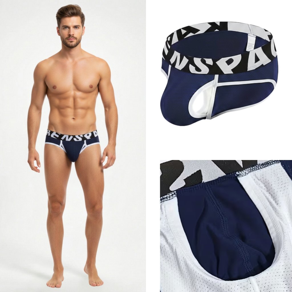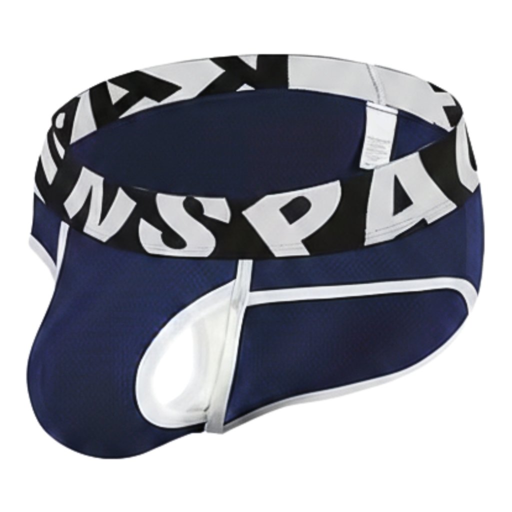 Bílá síťovaná látka (mesh) v oblasti rozkroku.