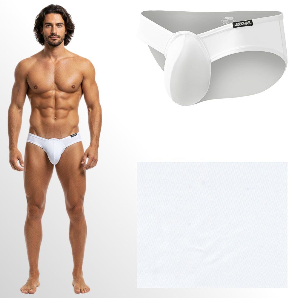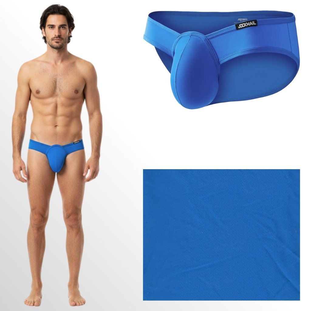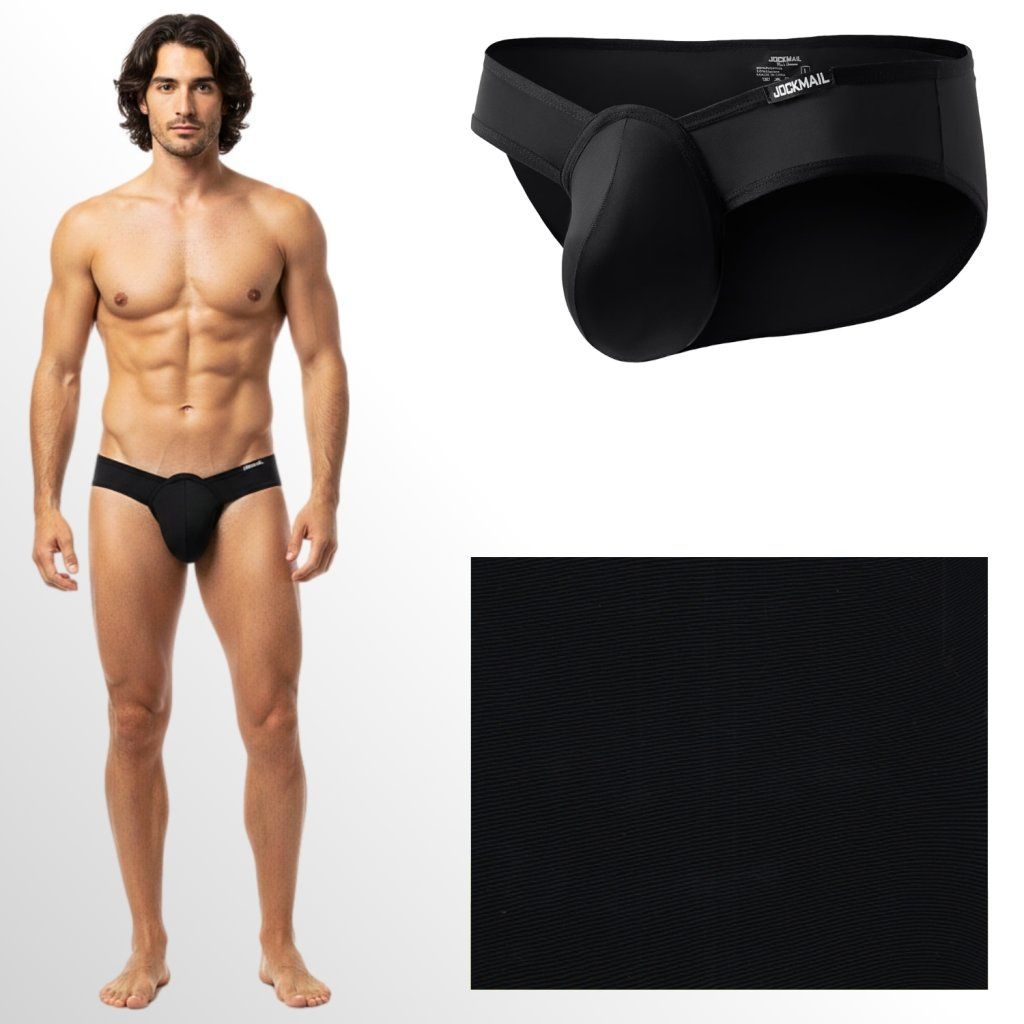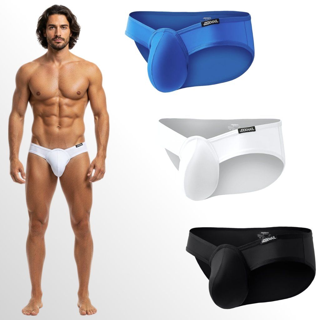 Anatomické tvarování: Přední váček (pouch) je střižen tak, aby poskytoval přirozenou podporu a zároveň opticky zvětšoval/zvýrazňoval mužské partie.